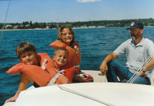 | Meaghan on her first sailing trip with Jessica and Andy, under the watchful eye of Captain Bill Earl, MD. Little Traverse Bay, MI. |